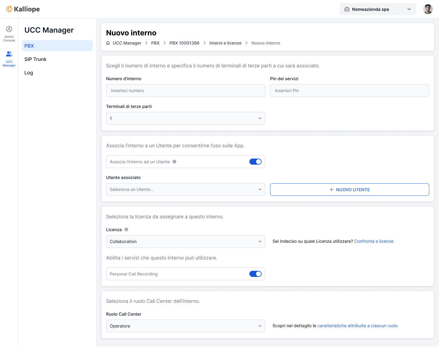Cliccare su «Nuovo PBX».