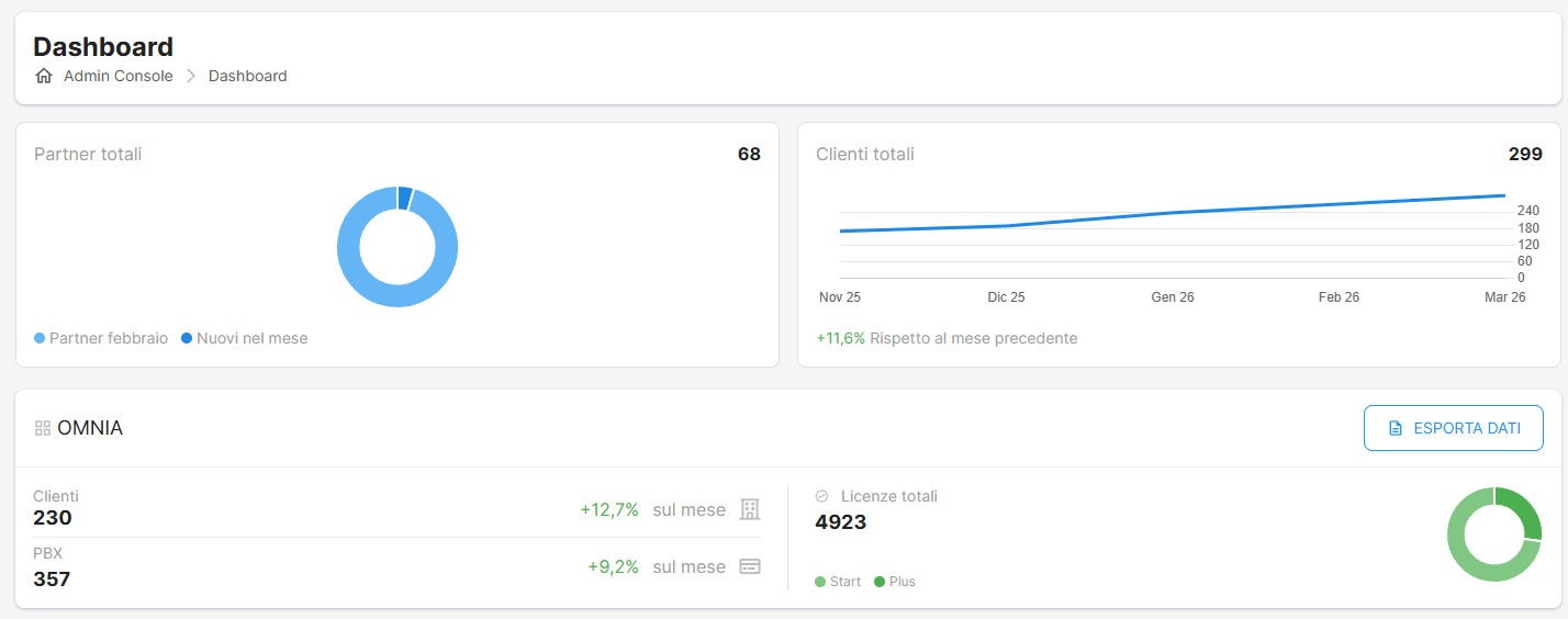 La Dashboard consente di avere una visione d’insieme delle statistiche dei partner, dei clienti, dei PBX e delle licenze tramite: