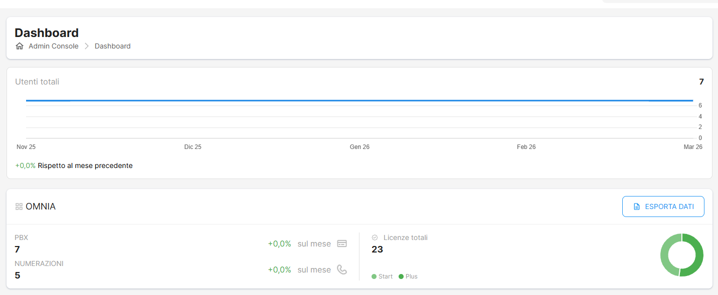 La Dashboard consente di avere una visione d’insieme delle statistiche degli utenti, dei PBX e delle licenze tramite: