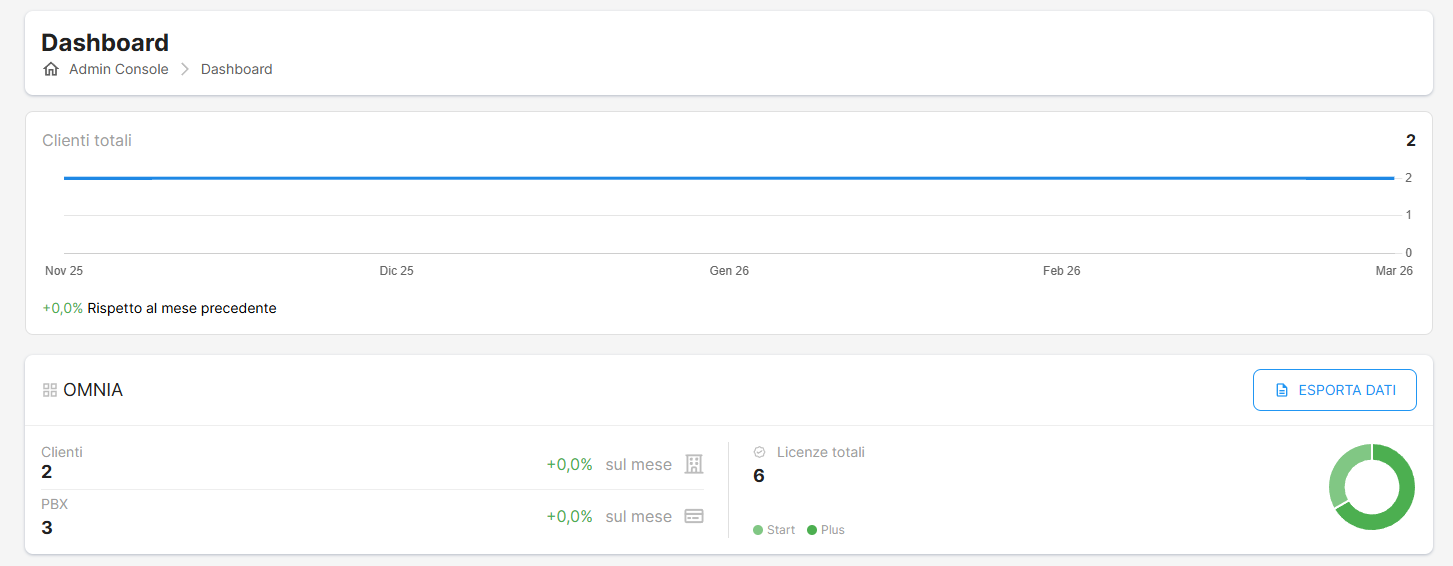 La Dashboard consente di avere una visione d’insieme delle statistiche dei clienti, dei PBX e delle licenze tramite: