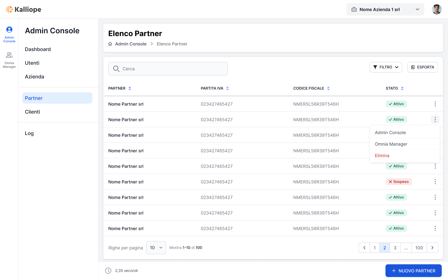 La sezione Partner dell’Admin Console permette di visualizzare l’elenco dei partner della piattaforma e crearne di nuovi.