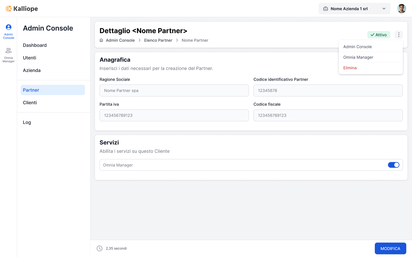 Una volta creato, per gestire l’Admin Console e l’Omnia Manager di un Cliente, il Partner deve selezionare la vista Cliente dal menu in alto a destra. Se invece desidera creare e gestire configurazioni proprie, può rimanere sulla vista Partner.