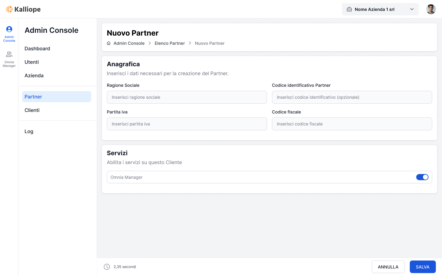 La creazione di una nuova Azienda Partner è consentita esclusivamente all’Azienda Brand da un Utente con il ruolo di Amministratore.